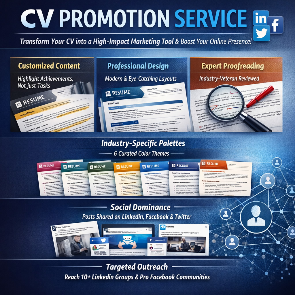 - Social Dominance: We craft and share professional posts of your new CV across LinkedIn, Facebook, and Twitter (X).