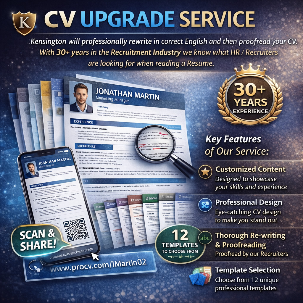 Boost your job search with Kensington's expert CV Enhancement Services. Get a professional Online CV, CV Upgrade & Promotion (CV rewrite including 12 unique professional templates designed to impress recruiters & shared across social media networks).