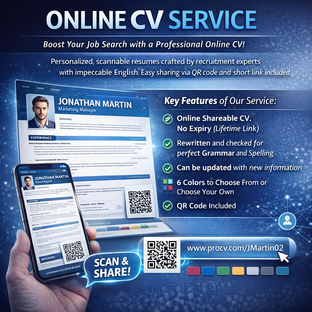 Boost your job search with a professional online CV. Our recruitment experts craft personalized, scannable resumes with impeccable English, ensuring you make a strong first impression. Easy sharing via QR code and short link included.